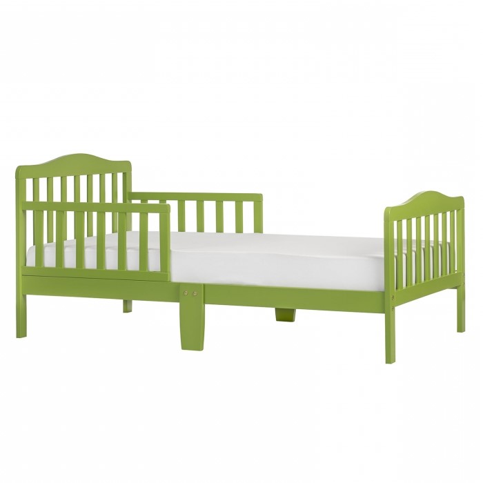 Dream On Me Classic Design Toddler Bed. This toddler bed features two side safety rails and sits low to the floor for ease in getting in and out of bed. Set at preciously the right height, it has been designed so that your toddler can safely get in and out of bed.