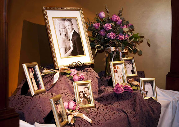 Funeral Decorations For Tables. One of the essentials of any personalized funeral service is a memory table. Memorial Memorabilia Table via Sublime Living.