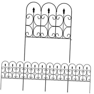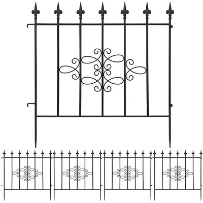 Amagabeli Decorative Garden Fence. This metal fence panels for front yard is made of black wrought Iron with vinyl PVC powder coated surface will enable you to use the garden fence outdoors durably; the decorative black iron garden flower bed fencing animal barrier is made of rustproof and weather. This classic iron fencing adds an attractive element that goes with a variety of home styles.